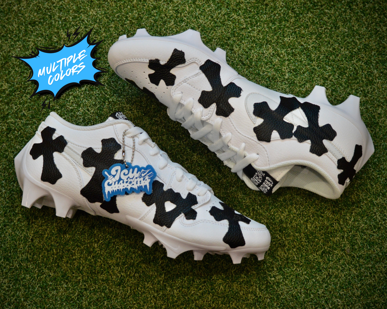 Chromey AJ1 is Chrome Hearts–inspired, featuring a crisp white base layered with bold black cross overlays for a clean, high-contrast statement that hits hard on the field. Each cross is crafted from premium cut leather and professionally bonded onto the cleat for a durable, elevated finish that blends luxury-inspired detailing with game-ready performance energy.