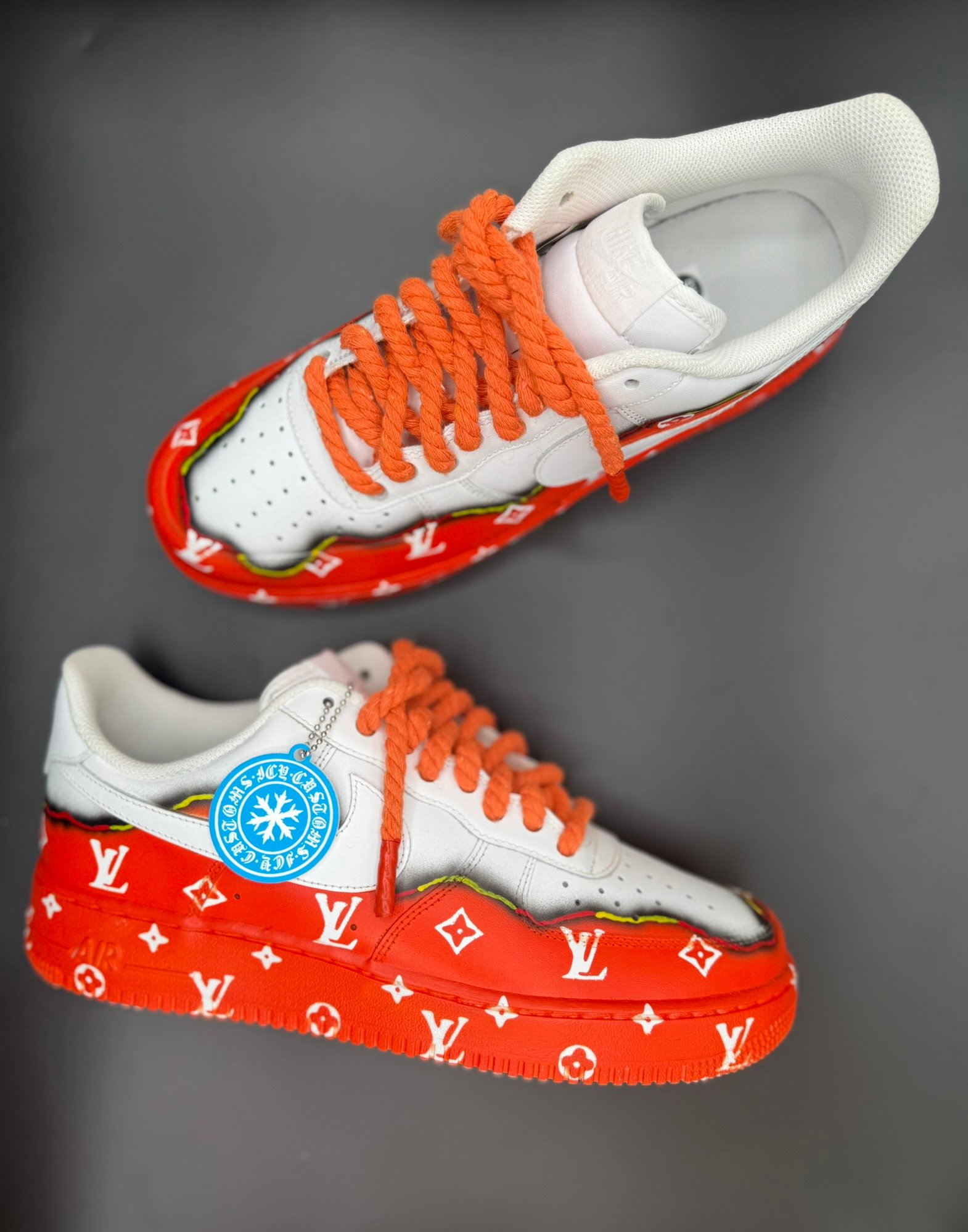 The Fuego LV AF1’s are straight pressure. Built on the timeless Force 1 silhouette, this pair brings bold, hand-painted luxury-inspired detailing with a blazing lower wrap that demands attention. The contrast upper keeps it clean while the vibrant base and custom pattern work turn every step into a statement. Classic foundation. Loud execution. zero cooling off.