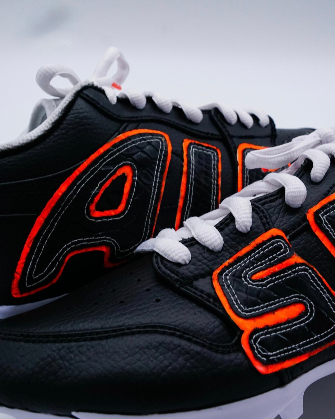 A bold reconstruction featuring a premium black leather base accented with vibrant solar orange stitched outlines and oversized lettering. Finished with crisp white detailing for contrast, this hand-sewn design delivers statement energy with elevated craftsmanship. CPFM AF1 Inspired!